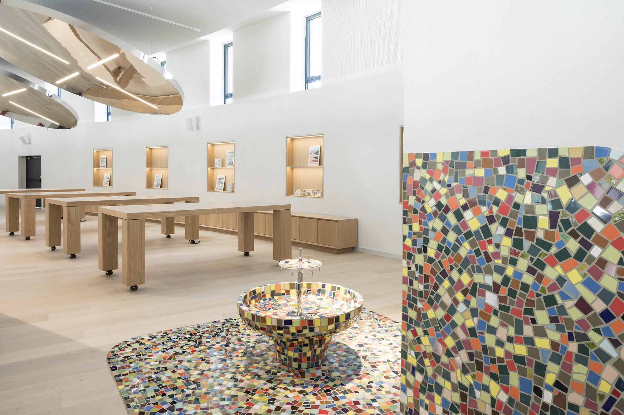 L’objectif : créer un espace galerie moderne et accueillant pour le centre des visiteurs de McArthurGlen, en mettant en valeur une fontaine mosaïque et une installation artistique forestière de 9 mètres, réalisées par des artistes locaux en collaboration avec l’architecte Mathieu Lehanneur.