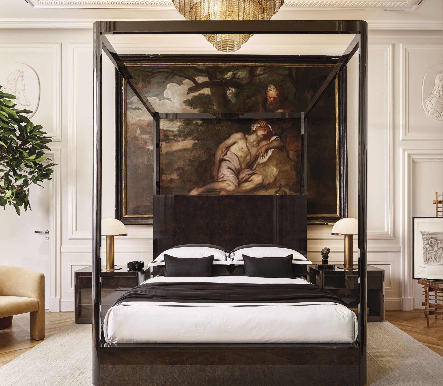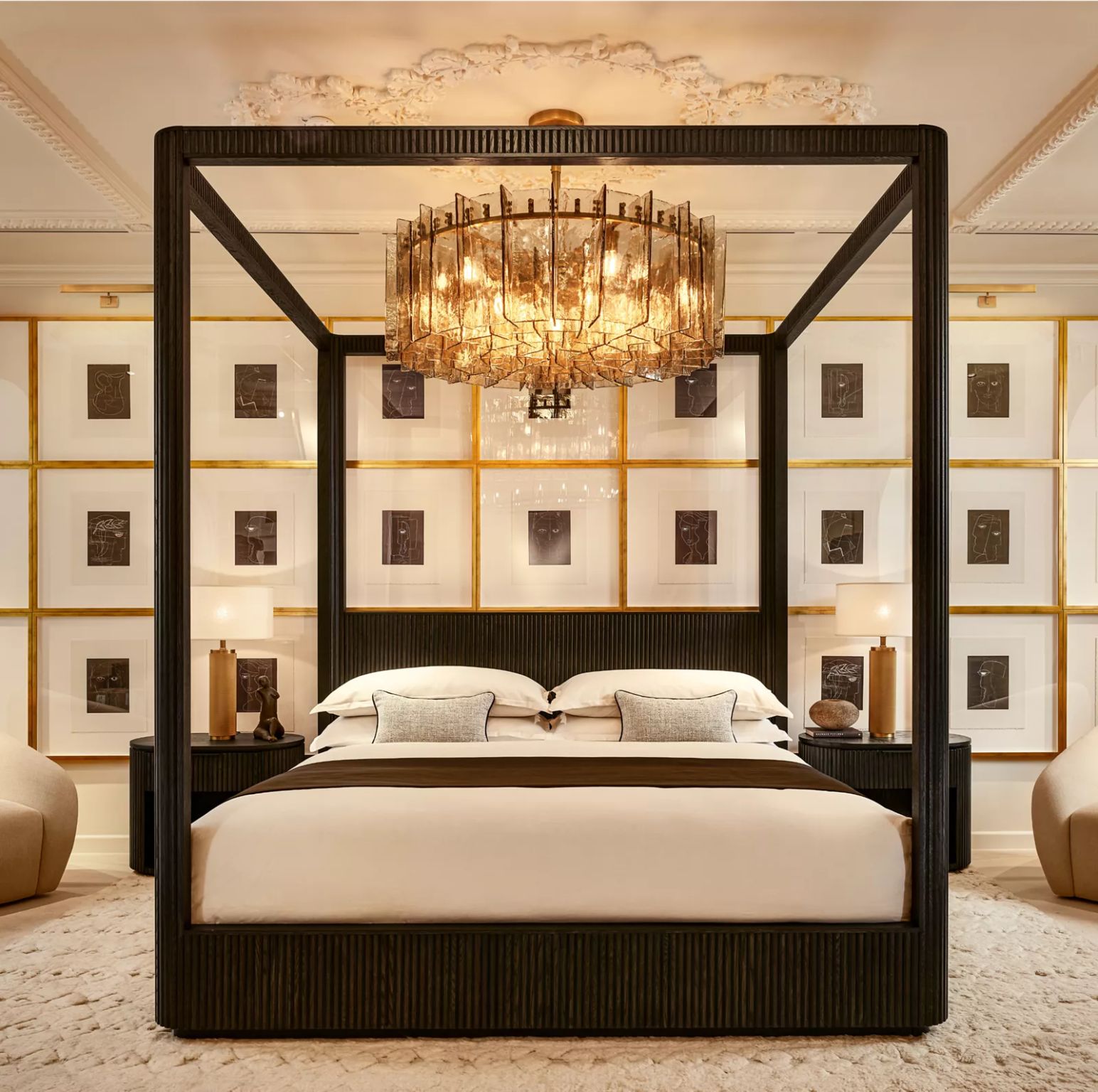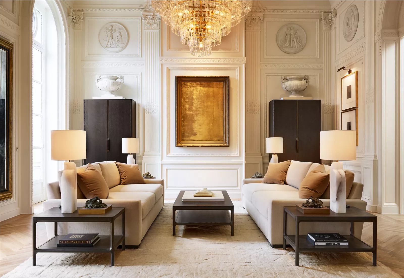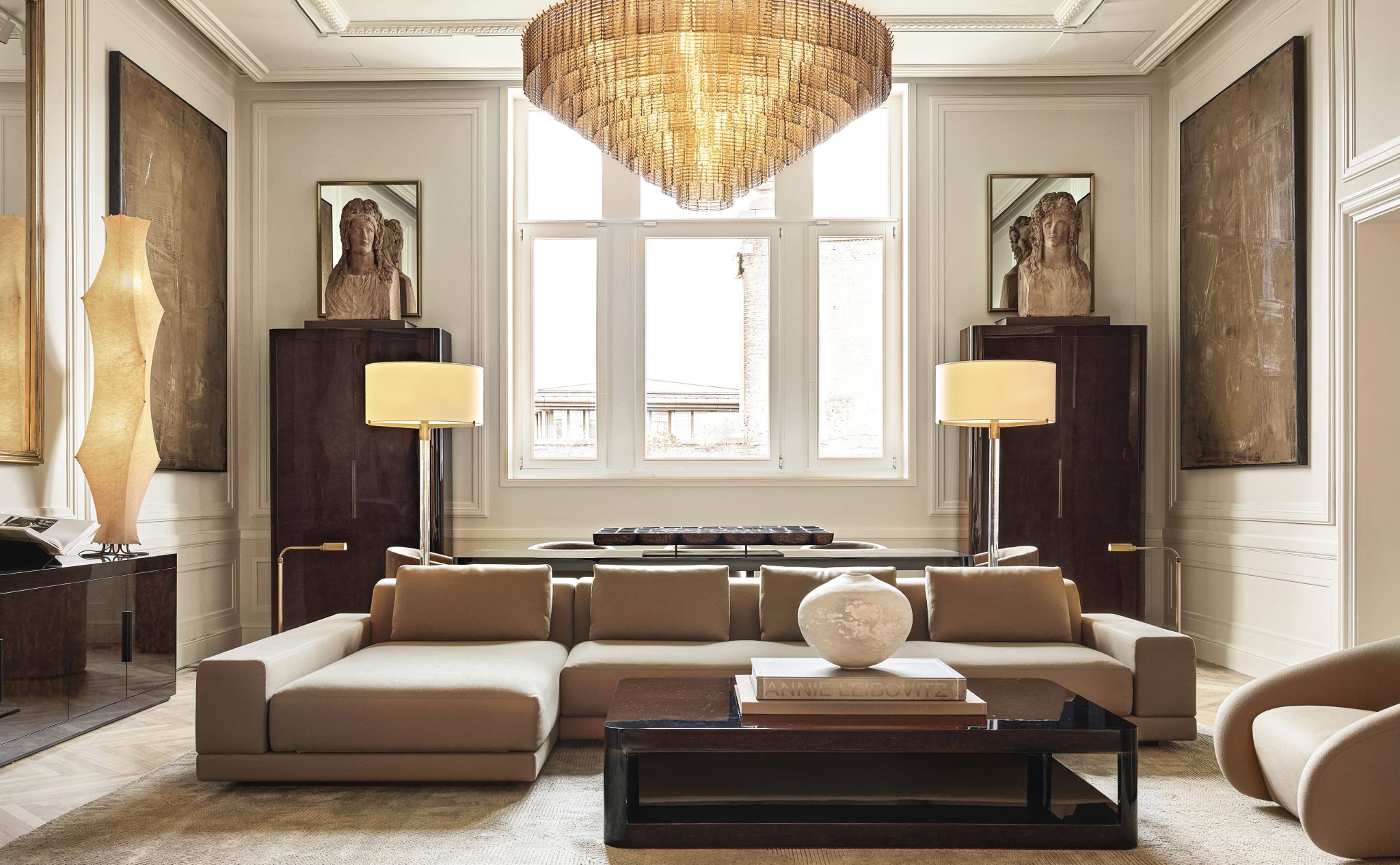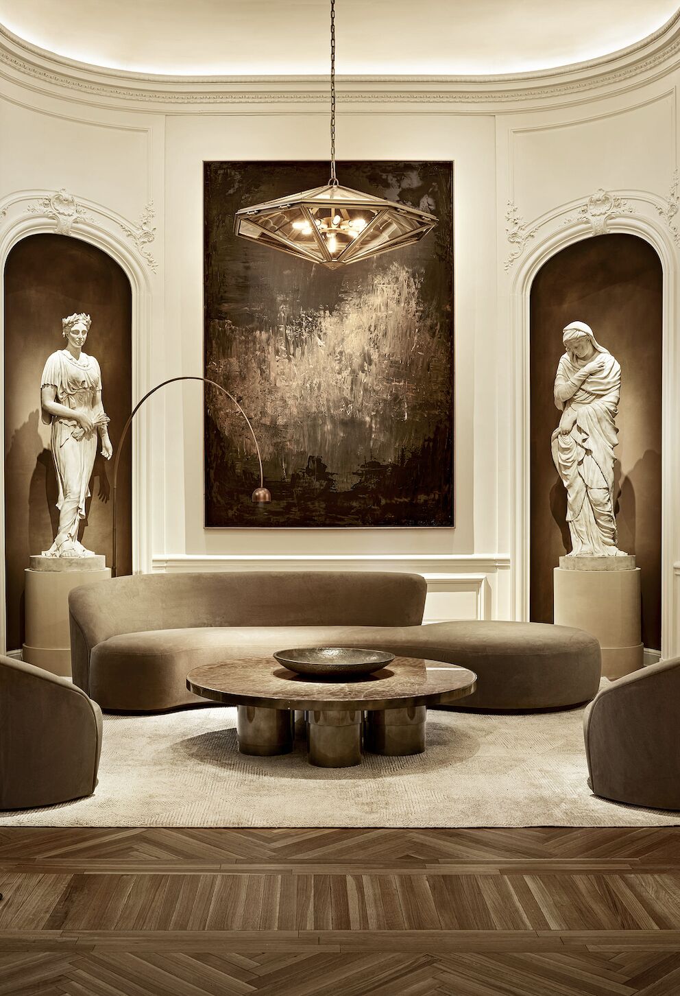 Création d’un espace de 4 000 m² sur cinq niveaux, mêlant meubles de luxe et installations artistiques, inspiré par les intérieurs parisiens grandioses.